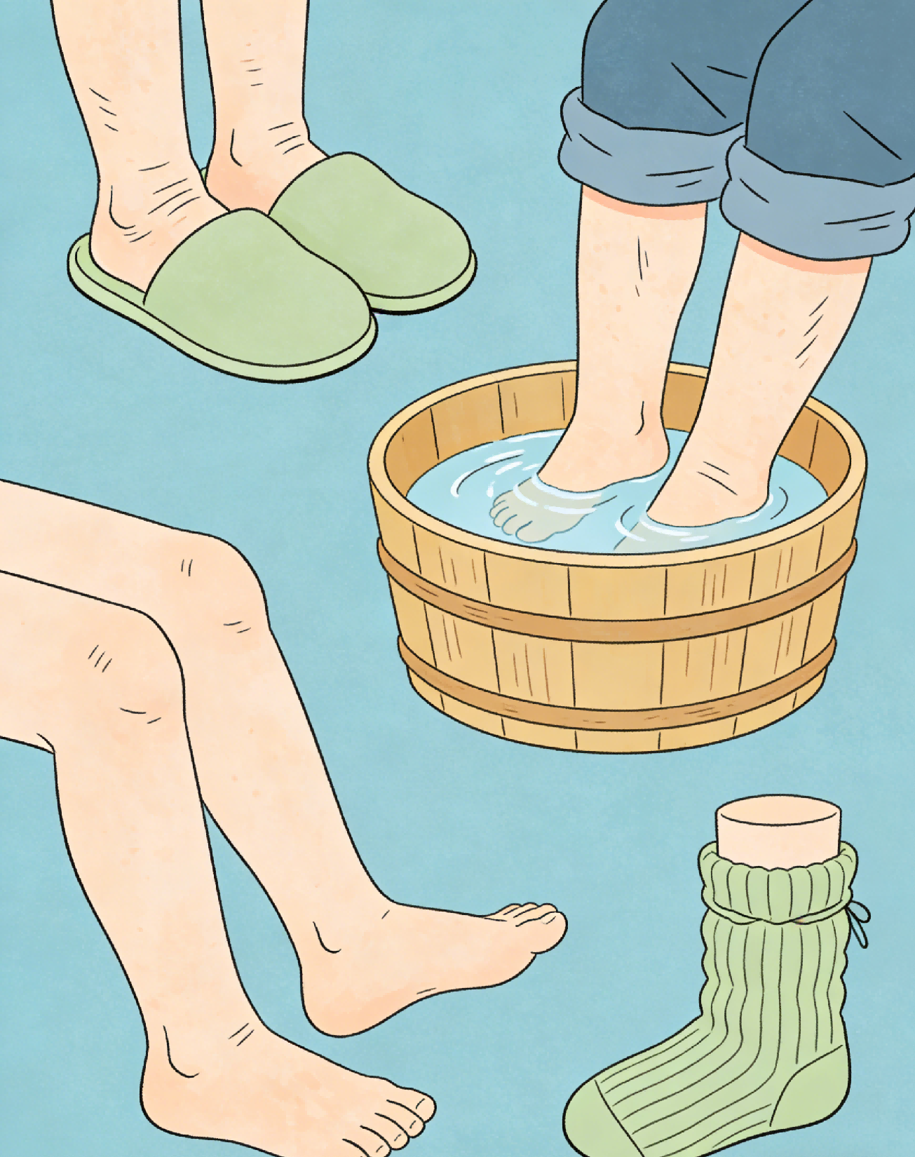 2、足部护理与保暖:每日用温水泡脚(水温35-40℃),促进血液循环;修剪脚趾甲(避免过短过尖),检查足部是否有破损、老茧(及时处理,避免感染);做好足踝保暖,避免受凉诱发疼痛。