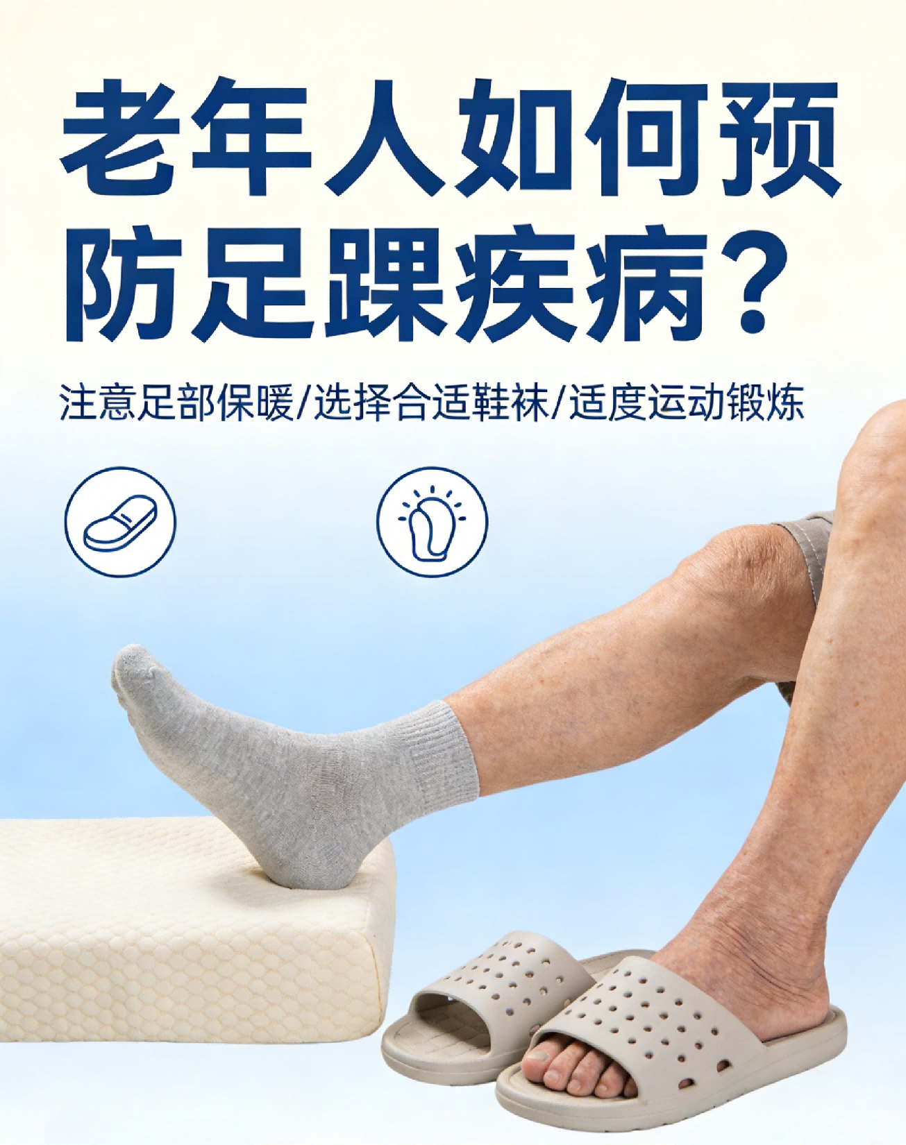 老年人预防足踝疾病,核心是“减负+防护+养护”,结合老年人骨骼退变、肌肉萎缩、平衡能力下降的特点,从日常走路、穿鞋、训练、护理多方面入手,降低疾病风险。