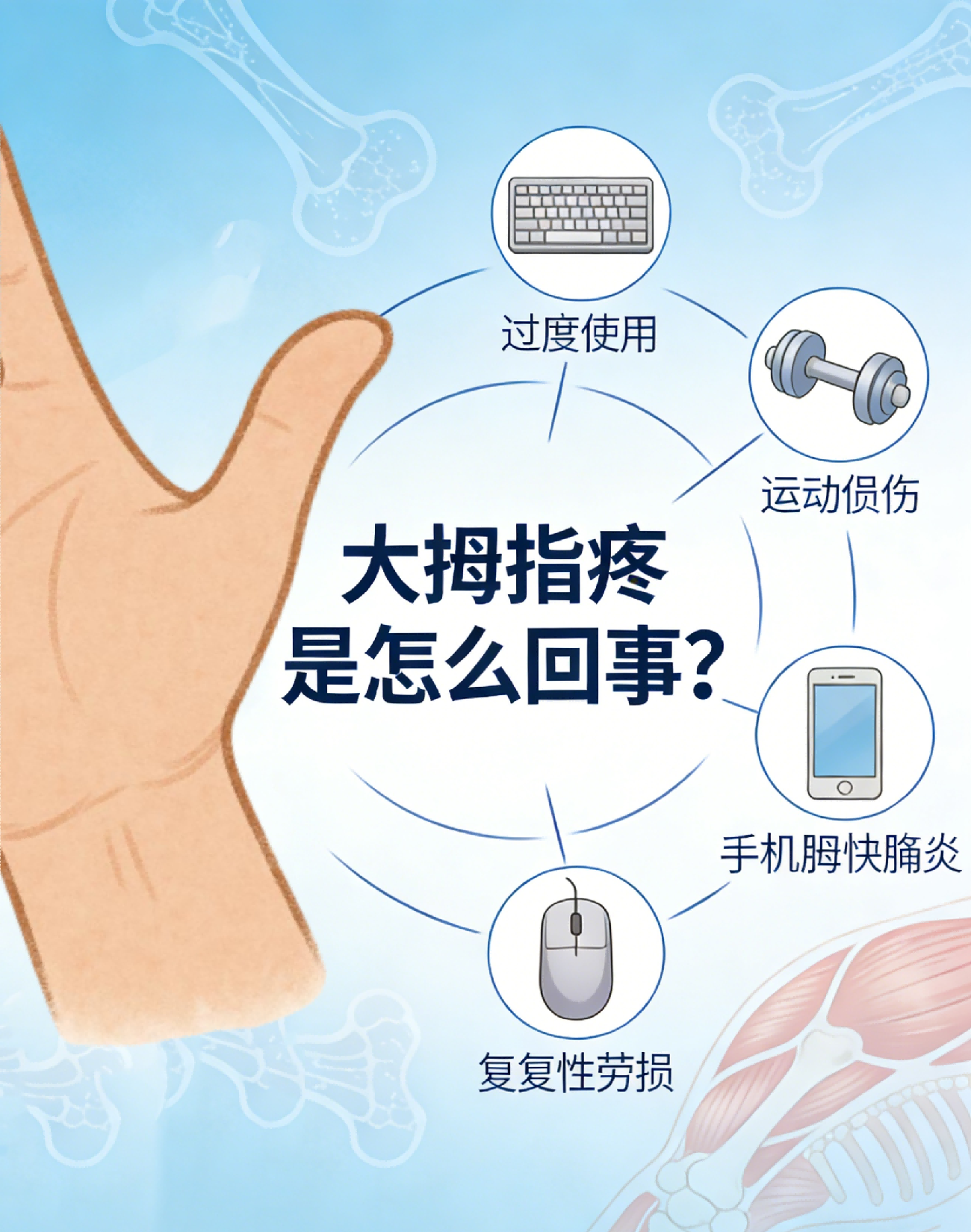 大拇指疼多由外伤、劳损、炎症、关节病变等导致,不同原因伴随症状不同,需针对性处理。