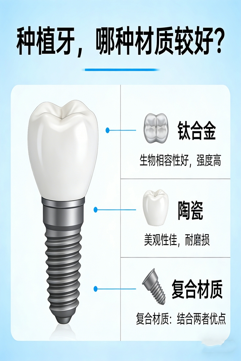 种植牙种植体首选纯钛或钛合金,生物相容性最佳;牙冠推荐全瓷材质,美观通透且不影响影像学检查。
