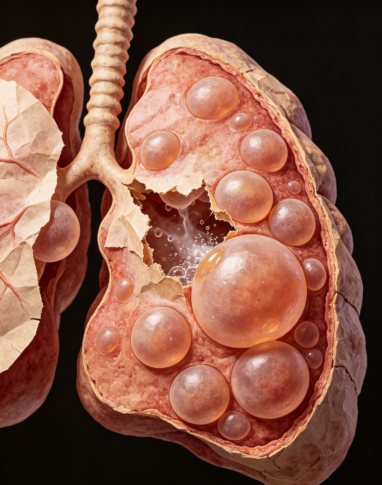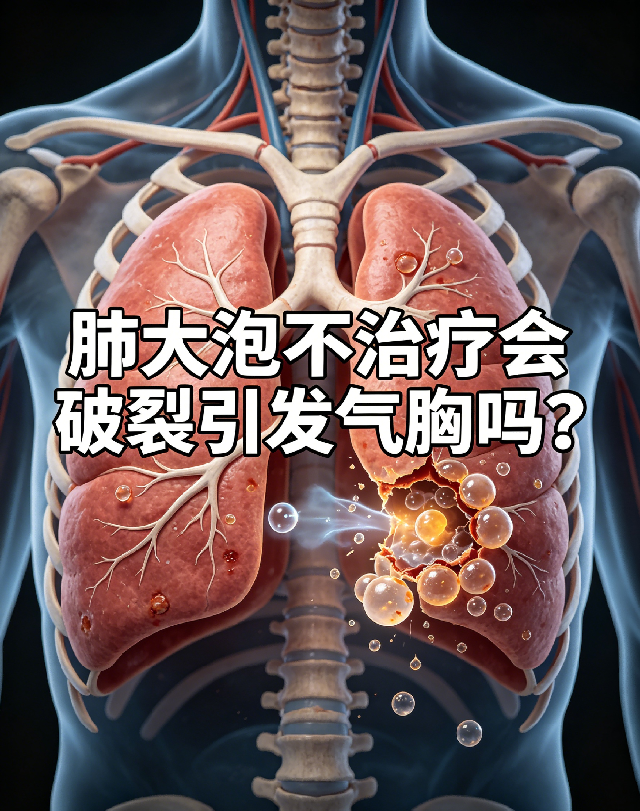 具体说明:小的肺大泡,无明显症状,破裂风险较低,可定期观察;体积较大、数量较多的肺大泡,肺泡壁较薄,剧烈咳嗽、用力排便、剧烈运动等外力刺激,都可能导致肺大泡破裂,气体进入胸腔,引发气胸;气胸发作时,会出现突发剧烈胸痛、呼吸困难,需立即就医急救。
