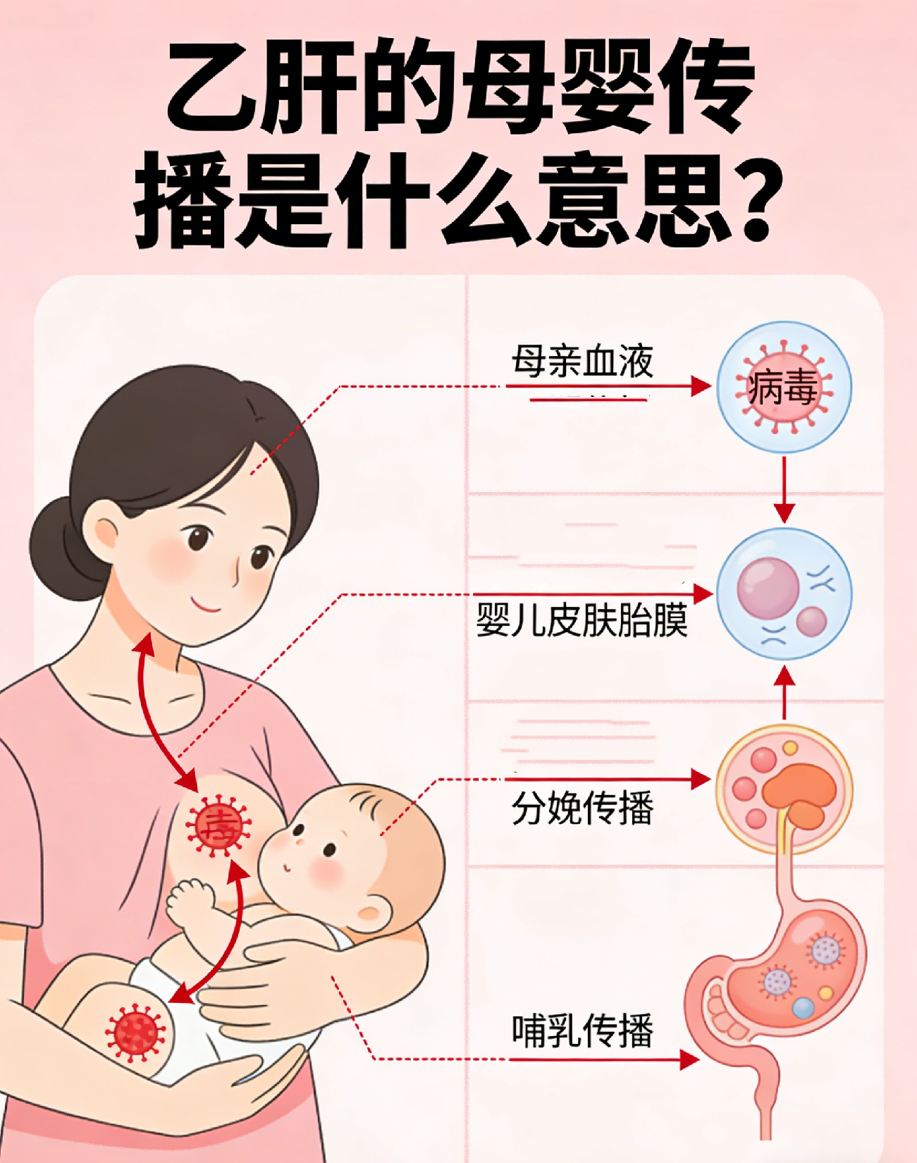 传播主要发生在分娩过程中,新生儿接触母亲的血液和体液而被感染。宫内感染和产后哺乳传播的概率相对较低。如果不进行干预,乙肝“大三阳”母亲所生婴儿的感染率可高达80%-90%。