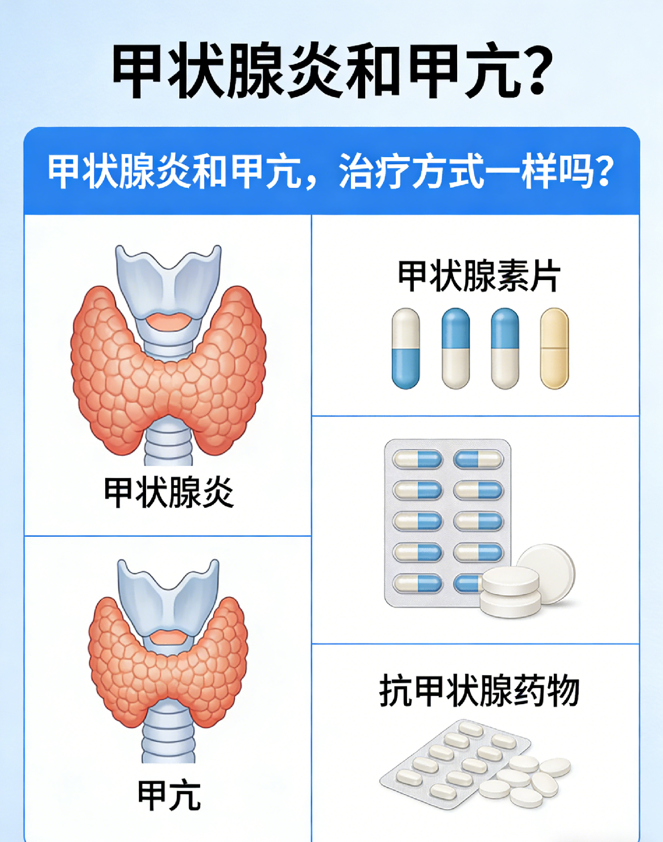 甲状腺炎和甲亢的治疗方式完全不一样,绝对不能混为一谈。甲亢通常是甲状腺激素分泌过多,需要用抗甲状腺药物、碘131或手术来减少激素。而甲状腺炎很多是病毒或免疫引起的炎症,早期可能暂时甲亢,但不需要抗甲亢药物。