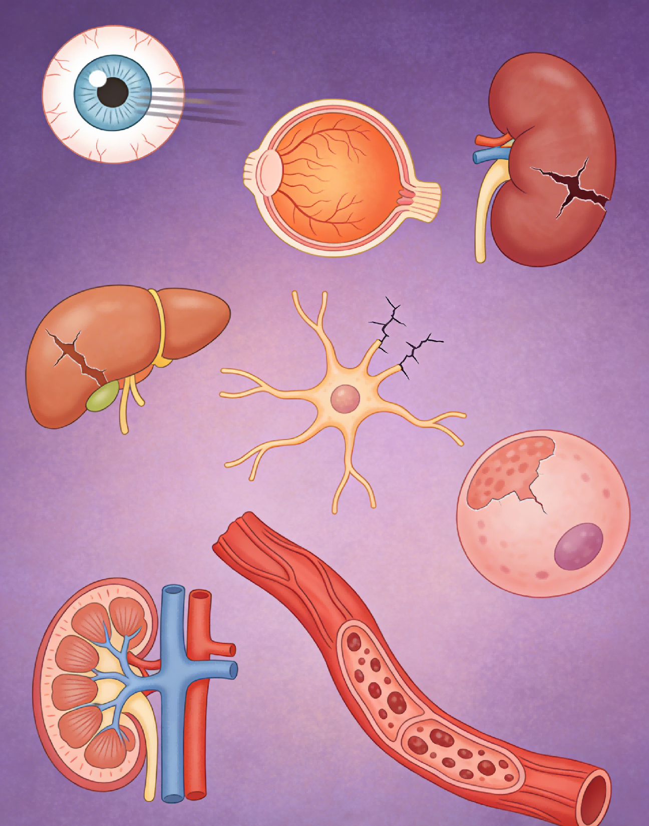 高血糖会让大血管硬化狭窄,增加心梗、脑梗、下肢动脉硬化风险;微血管受损则导致肾病、视网膜病变,严重可致尿毒症、失明。神经受损会出现麻木、疼痛、肠胃紊乱、性功能减退。