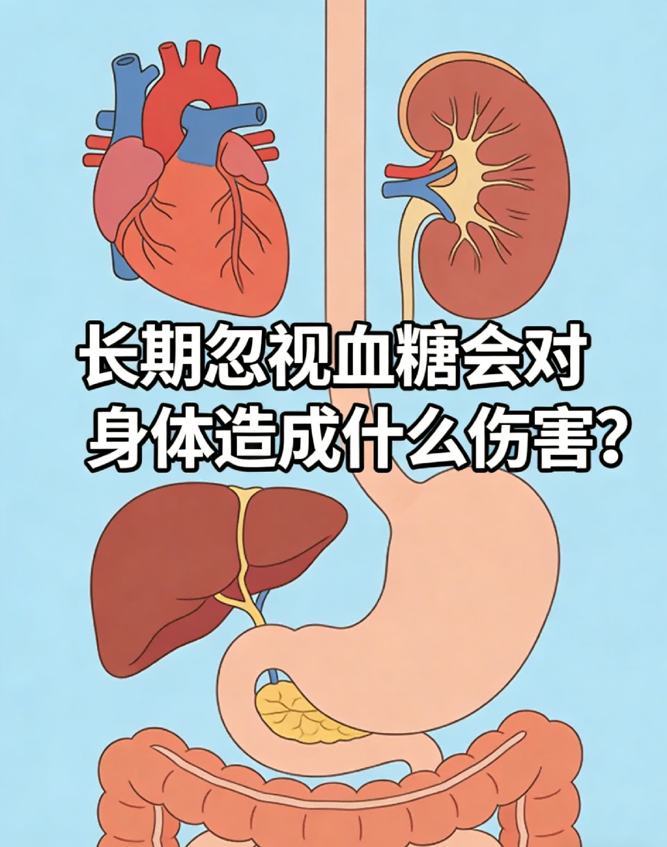 长期忽视血糖、放任偏高,会持续损伤全身血管和神经,逐步引发心、脑、肾、眼、足等多处并发症,伤害不可逆。短期可能无症状,但长期损害会悄悄累积。