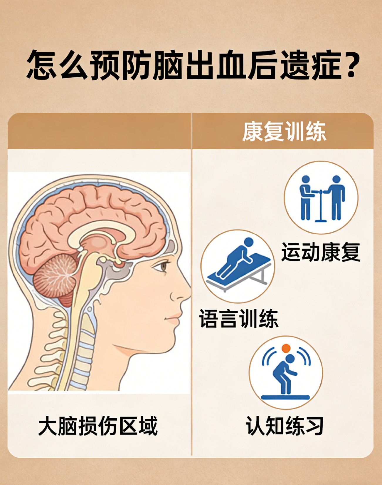 脑出血后遗症预防关键在急性期规范治疗、康复训练和长期危险因素控制。