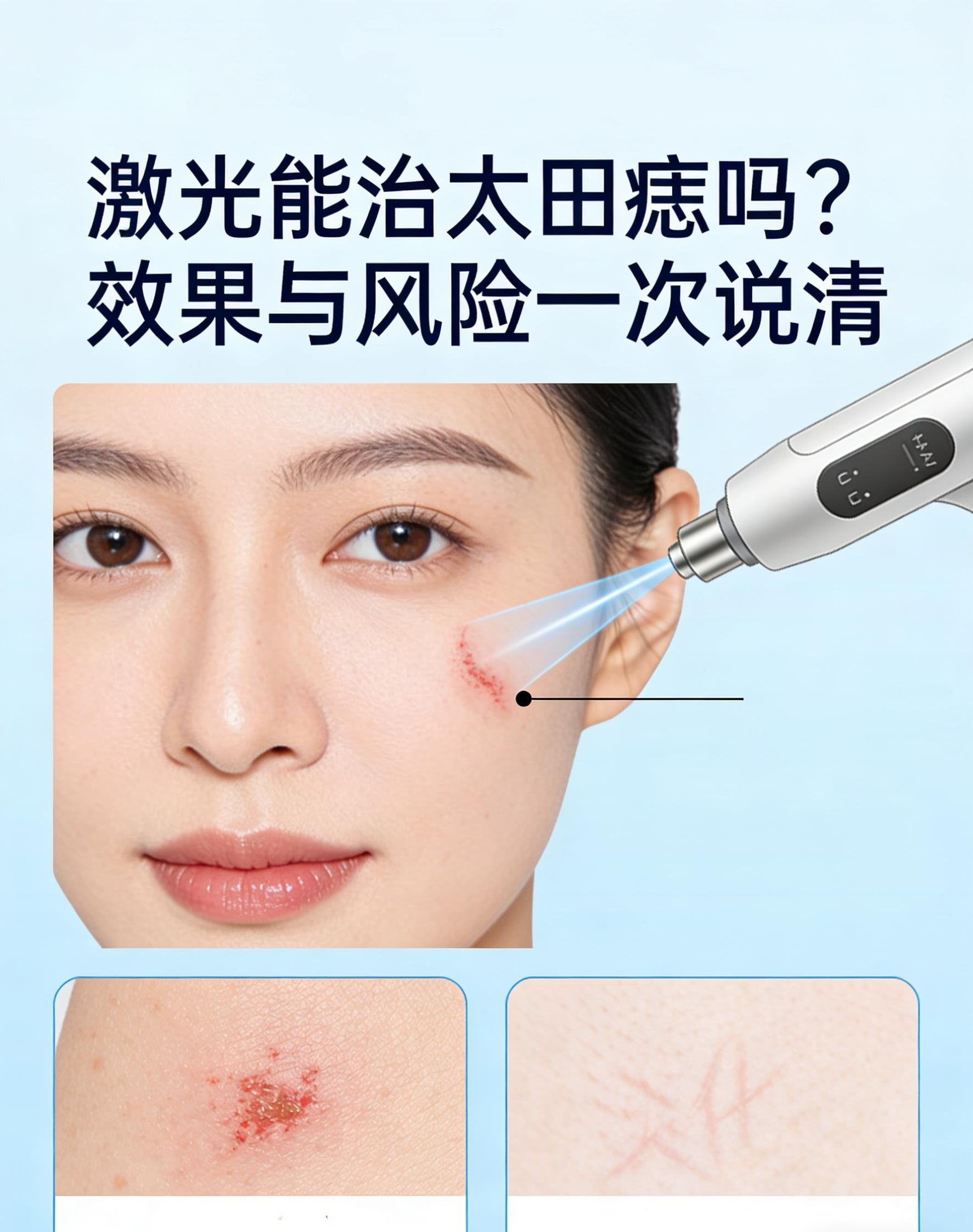 风险:术后暂时性红肿、结痂(1周左右消退);少数出现色素沉着或减退,多在3-6个月恢复;极少数复发。需选择正规机构、有经验医生操作,避免能量不当致烫伤或瘢痕。术后严格防晒,防止反黑。