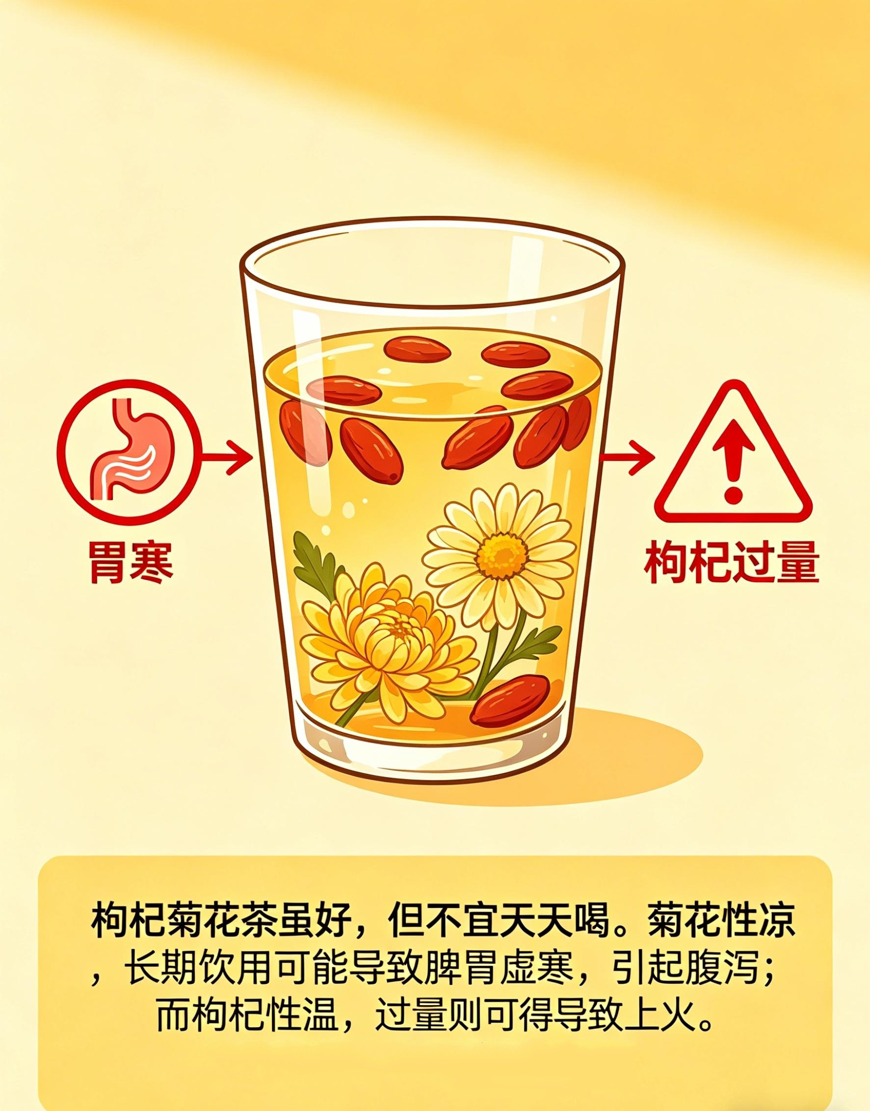 枸杞菊花茶不宜天天喝,否则可能引发2个副作用:一是过量饮用可能损伤脾胃阳气,导致腹痛、腹泻等症状;二是枸杞含糖量较高,长期大量饮用可能引发血糖升高问题。枸杞能滋补肝肾、益精明目,菊花能清热解毒、平肝明目,二者搭配虽好,但需适量饮用。