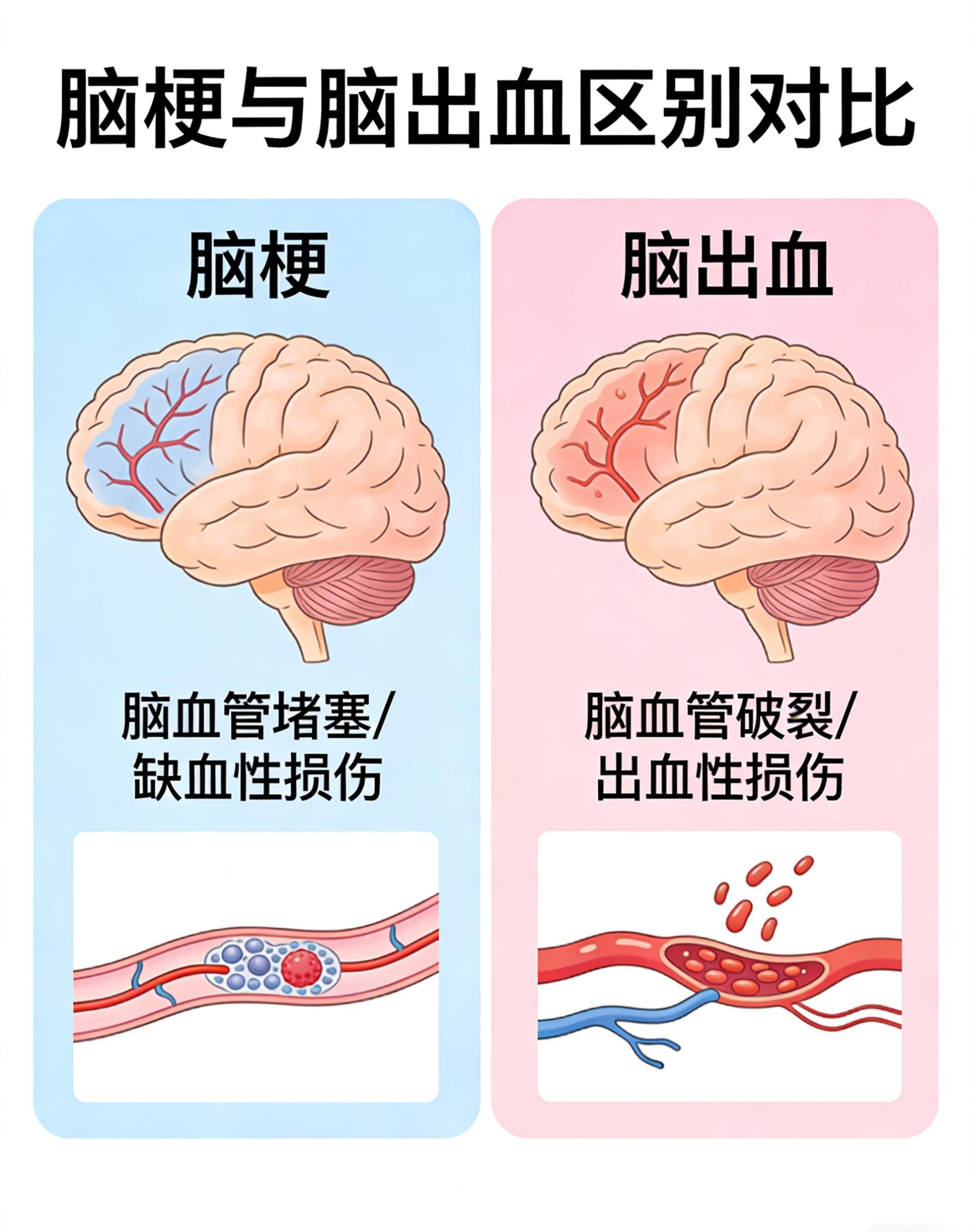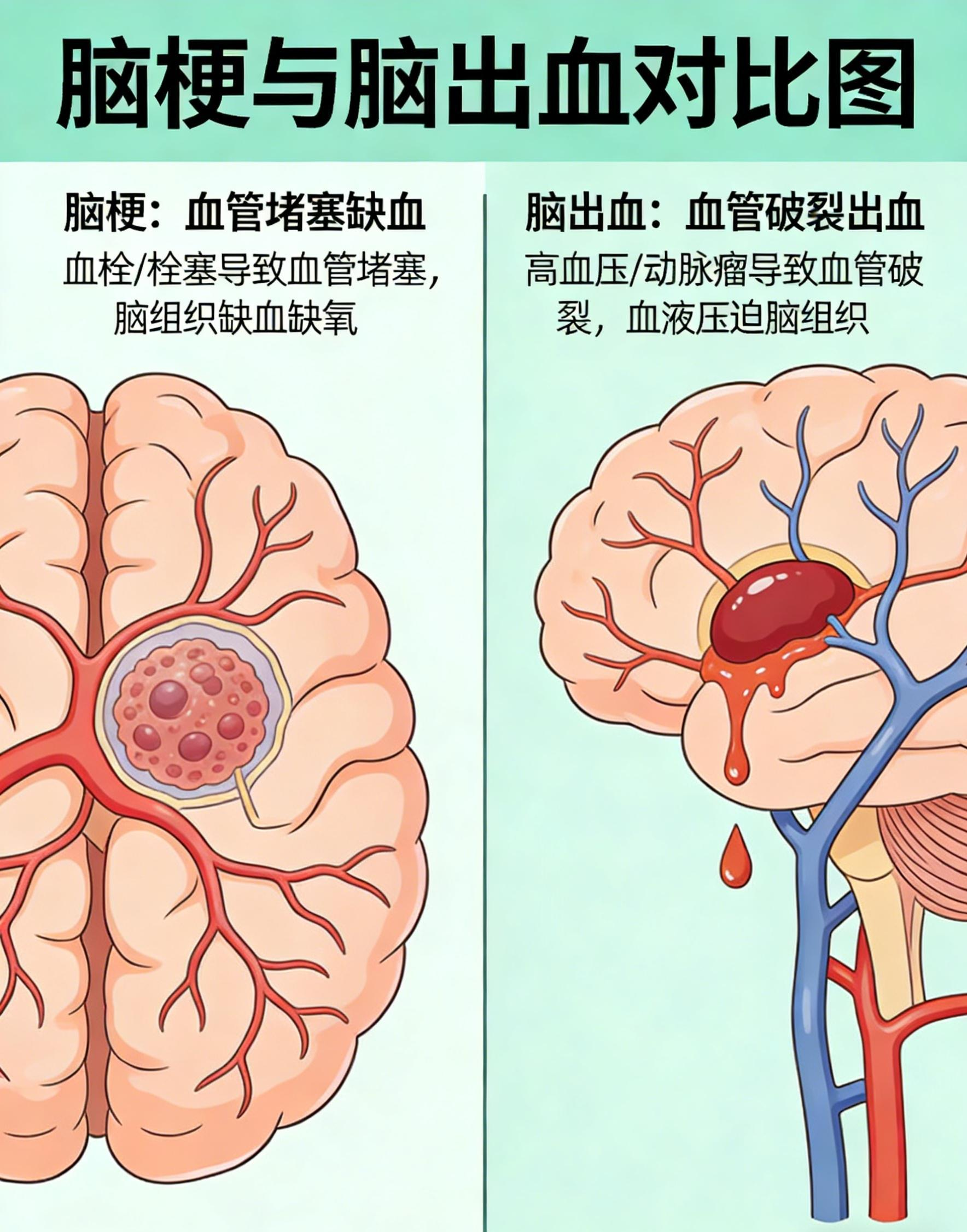 脑梗是血管堵塞,脑出血是血管破裂,两者病因、症状和处理截然不同。