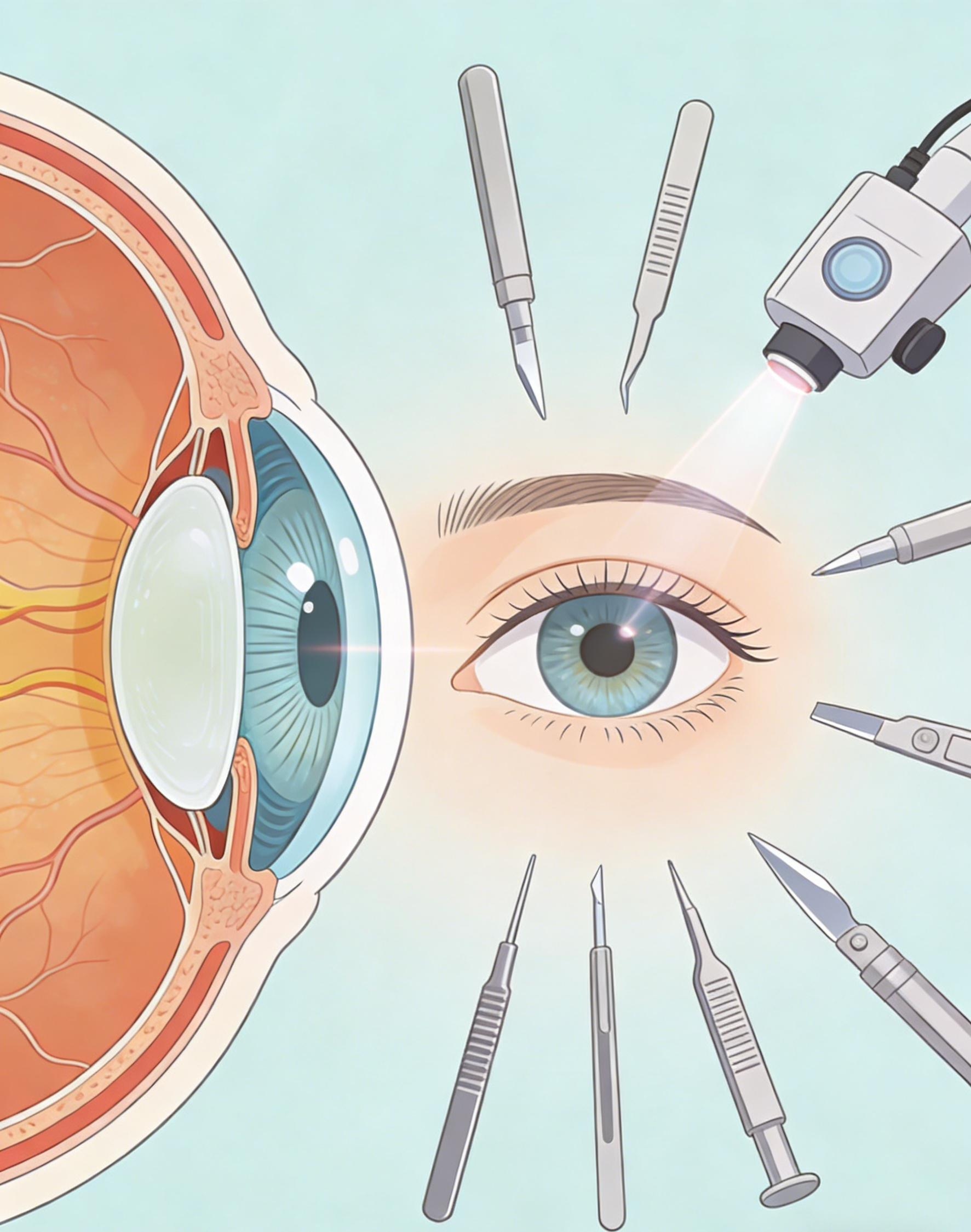 1、激光手术(全飞秒/半飞秒):适合角膜厚度足够(≥480μm)且剩余基质床厚度≥280μm的患者,通过切削角膜矫正视力,恢复快但可能引发干眼或眩光。