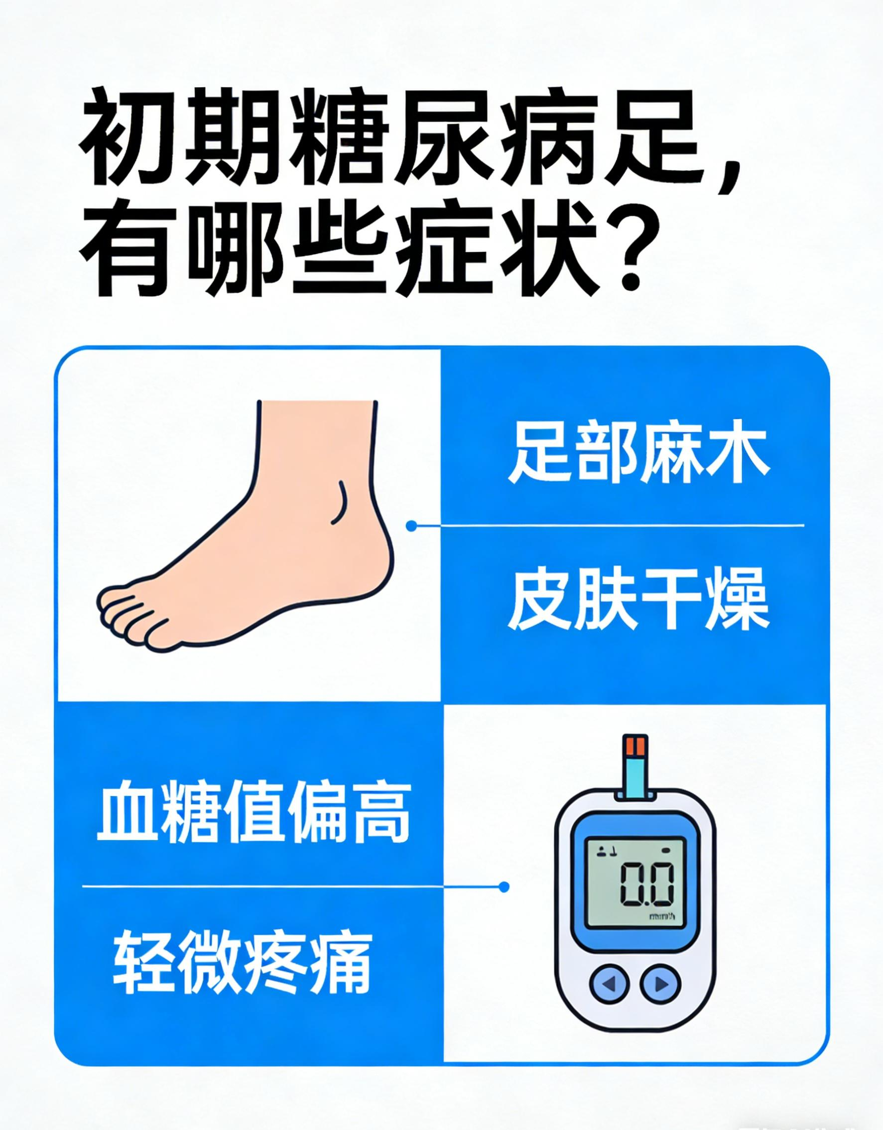 初期糖尿病足症状隐匿,常表现为足部感觉异常、皮肤干燥变色、间歇性跛行及微小伤口难愈合,需高度警惕。