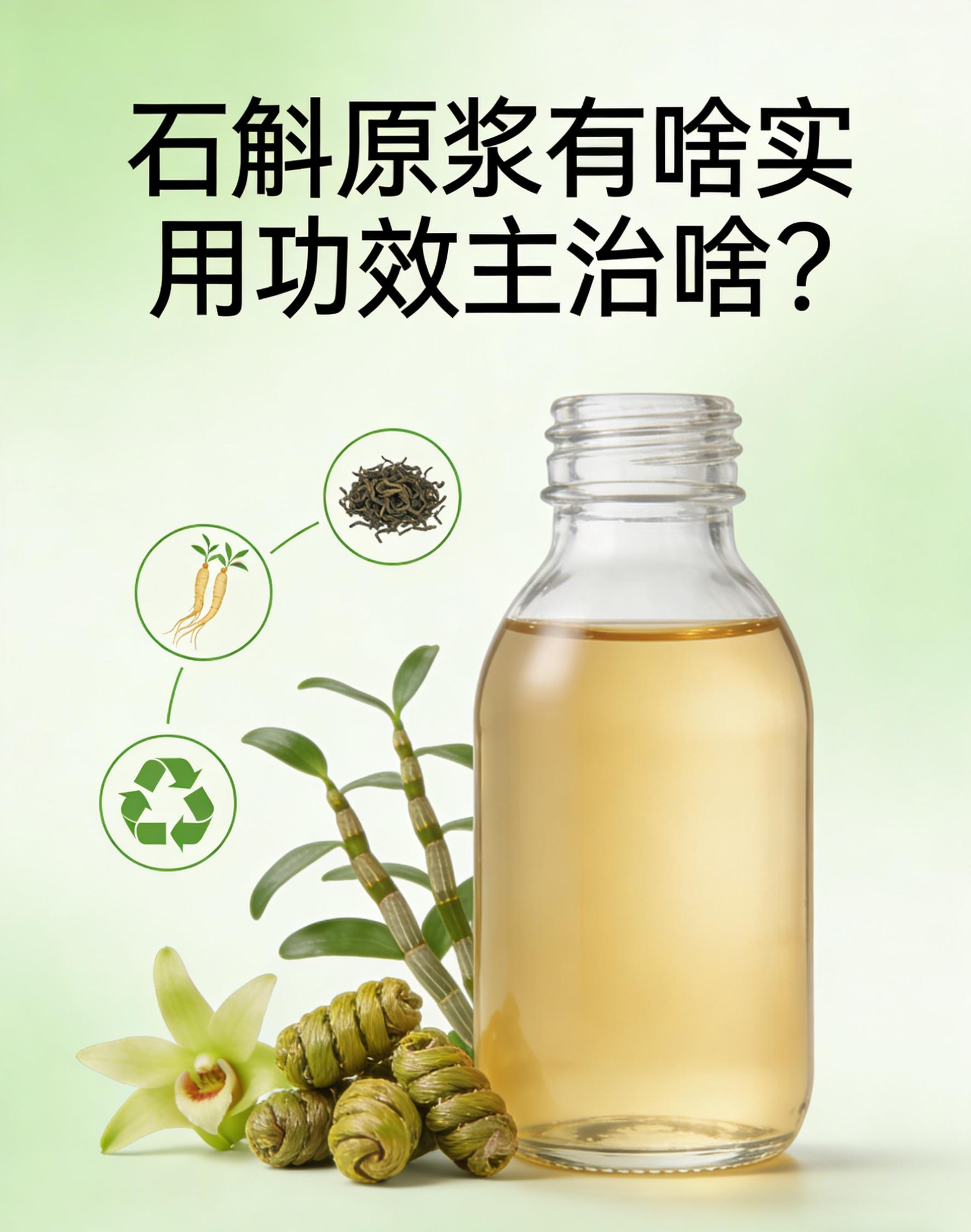 石斛原浆的实用功效是滋阴清热、益胃生津、滋养肝肾,主要主治阴虚火旺、胃阴不足、肝肾亏虚引发的多种不适,是优质的养生饮品。