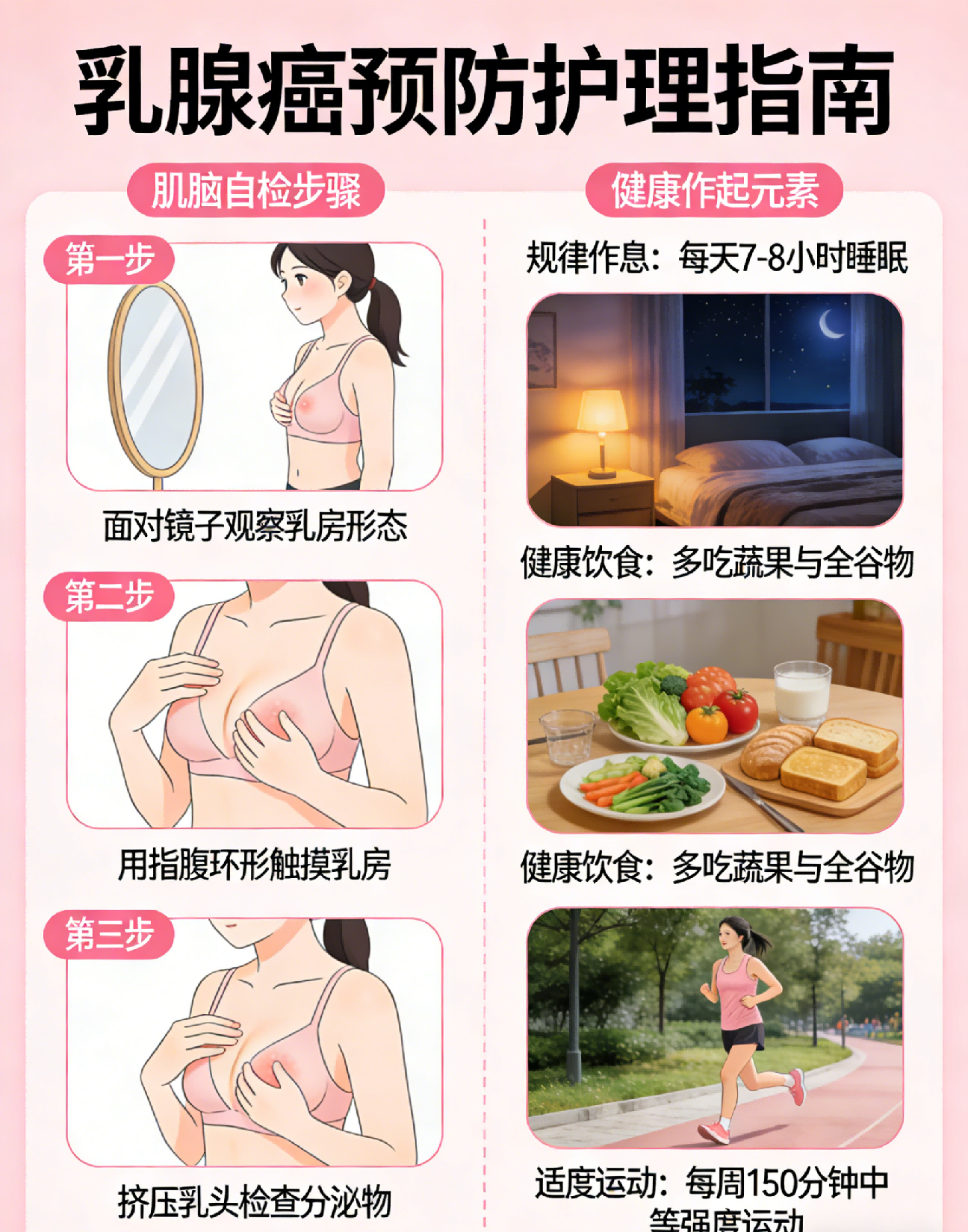 乳腺癌是女性常见恶性肿瘤,日常护理和生活习惯对预防有重要意义。预防主要通过健康饮食、规律运动、定期检查、情绪调理等方式实现。