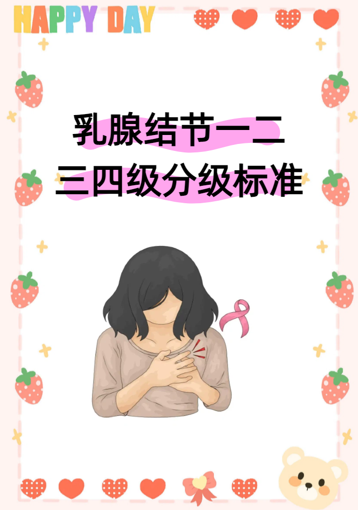 乳腺结节分级通常指BI-RADS分类。1级:阴性,未见异常。2级:良性发现,如单纯囊肿,恶性风险0%,常规年度随访。3级:可能良性,恶性风险<2%,建议短期(6-12个月)随访。
