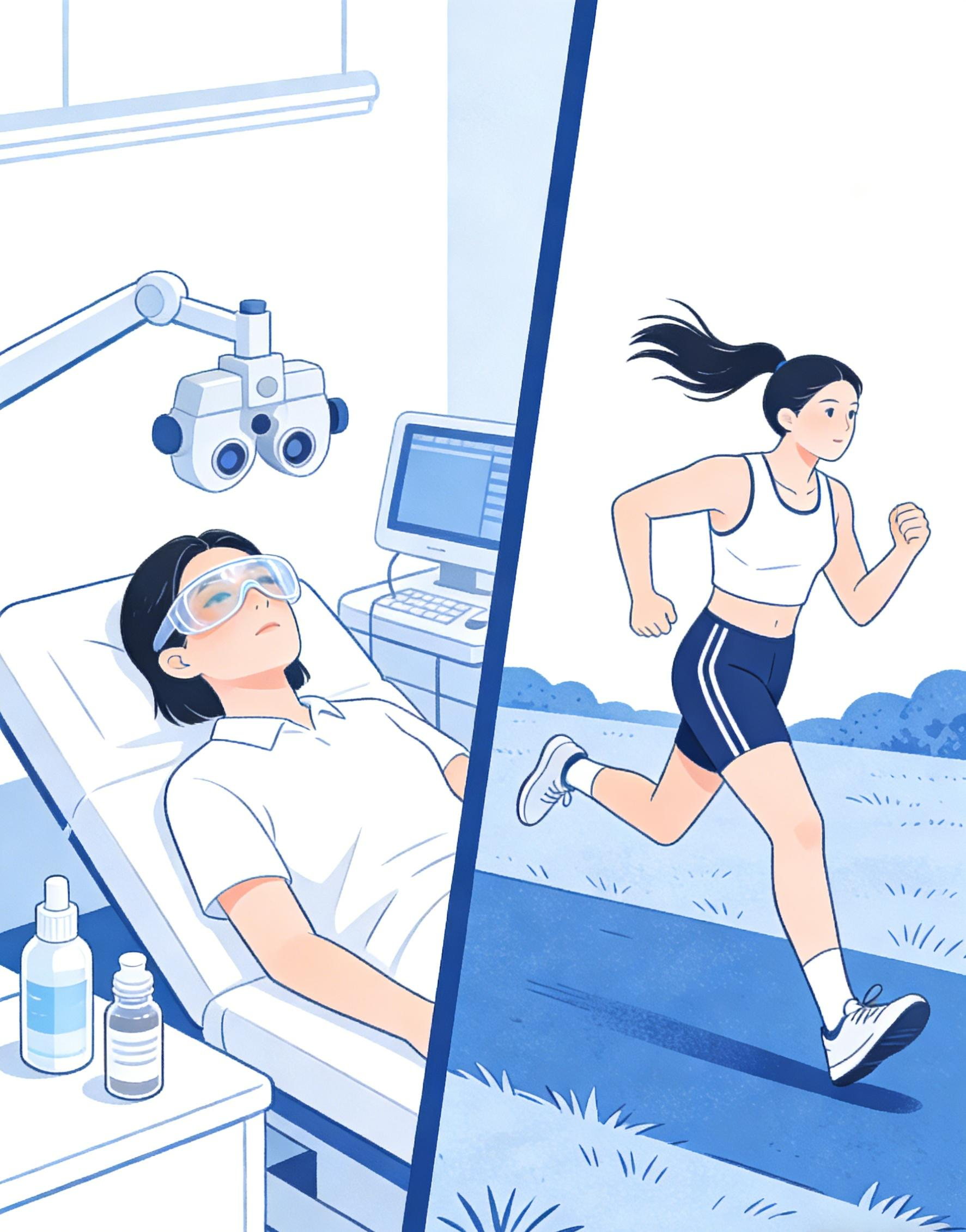 术后角膜未完全稳定,剧烈运动可能导致眼部撞击、异物进入,半飞秒还需防角膜瓣移位。可进行散步等温和运动,1个月后逐步尝试非对抗性运动。
