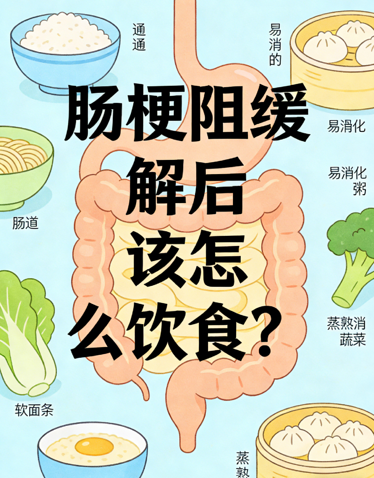 后期可逐渐过渡到软食、普通饮食,多吃富含膳食纤维、清淡易消化的食物,如蔬菜、水果、粗粮、优质蛋白,促进肠道蠕动,保持大便通畅。同时避免吃辛辣、刺激、油腻、生冷、坚硬的食物,避免吃产气多的食物(如豆类、红薯、洋葱),减少肠道胀气。