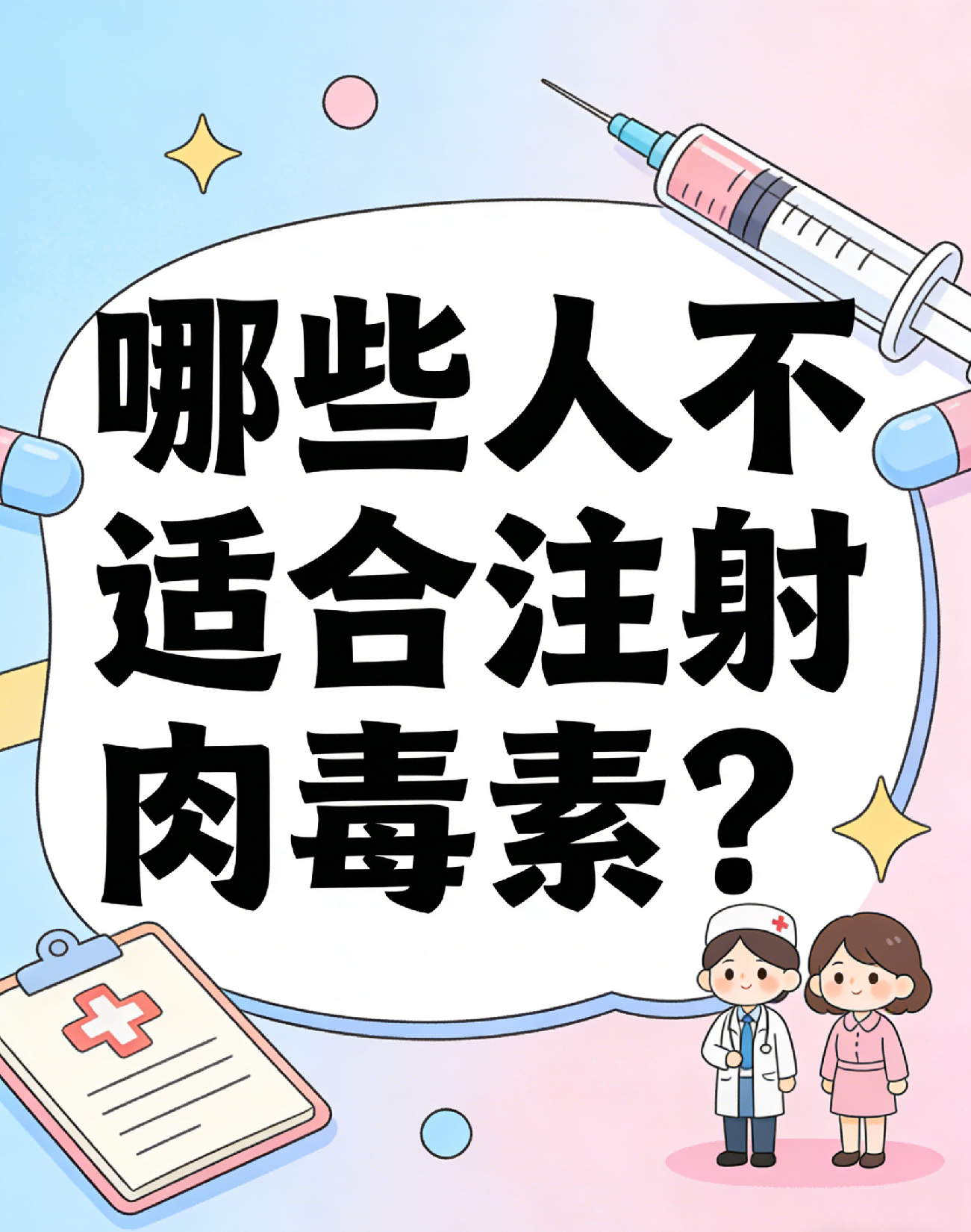 注射肉毒素美容并非人人适合,有几类人群注射后可能出现不良反应,甚至危及健康,需提前了解、主动规避,注射前务必告知医生自身情况,由医生评估是否适合。