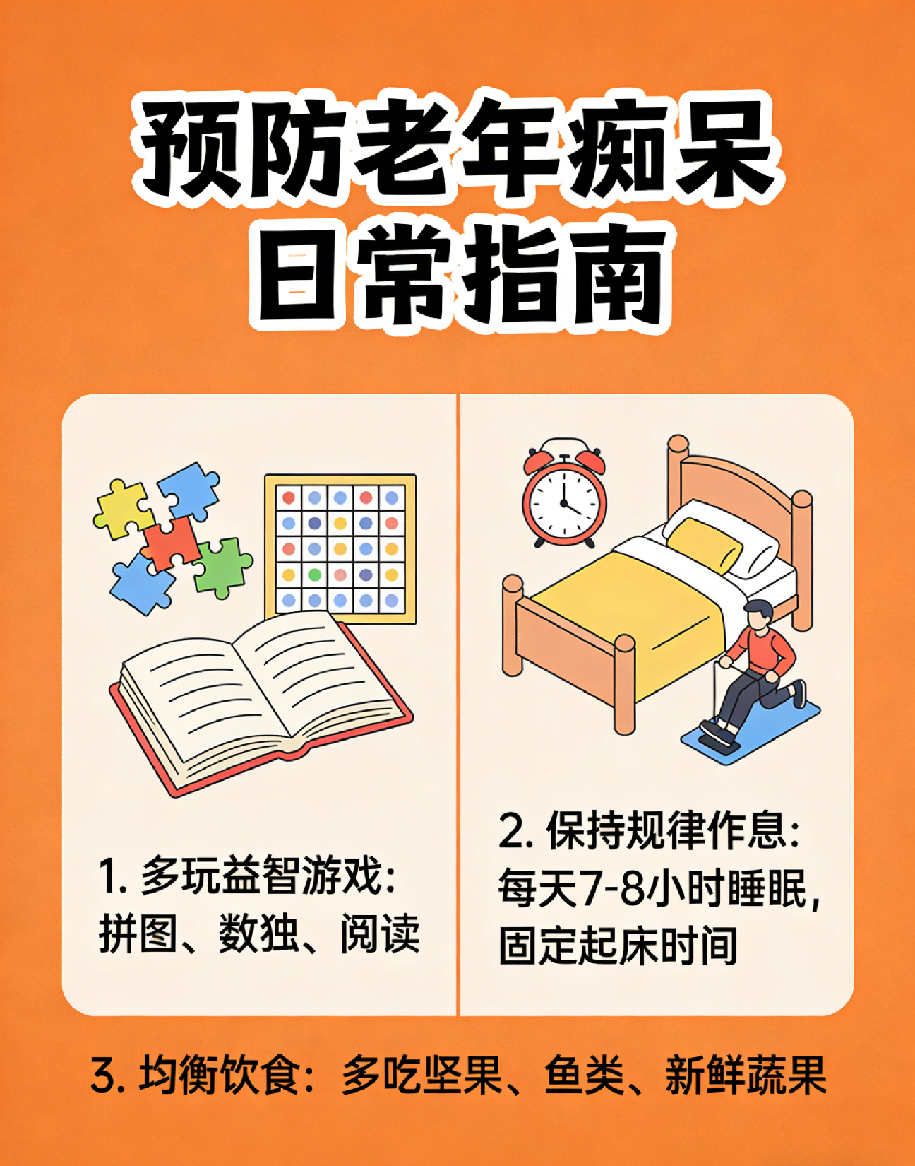 1、坚持脑力活动:多读书、下棋、做益智游戏,持续锻炼大脑思维,延缓神经衰退。