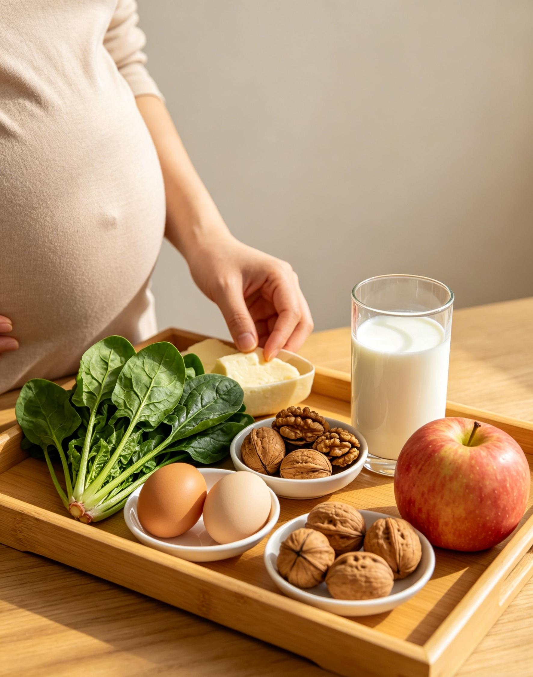 孕前期(备孕至孕12周)核心营养:叶酸(0.4-0.8mg/天)预防神经管畸形,多吃深绿色蔬菜(菠菜、西兰花)、豆类、动物肝脏(每周1次,不超过50g)。优质蛋白(鸡蛋、鱼、瘦肉、豆制品)促进胚胎发育。铁(红肉、动物血)预防贫血。碘(碘盐、海带每周1次)助胎儿智力。钙(牛奶、酸奶、豆腐)为胎儿骨骼储备。